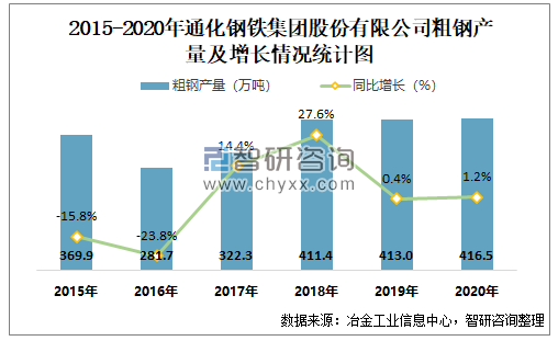 根据冶金工业信息中心数据显示:2020年1-12月通化钢铁集团股份有限公司钢材产量为416.3万吨,同比增长2.06%;粗钢产量为416.5万吨,同比增长1.24%;生铁产量为393.7万吨,同比下降1.59%。