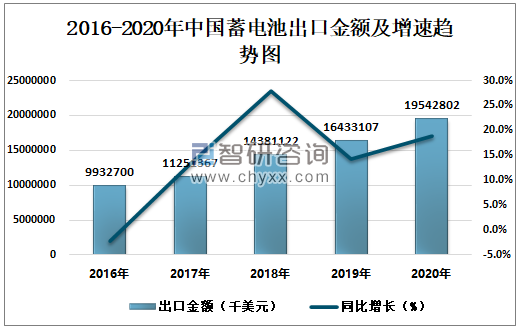 根据中国海关数据显示:2020年1-12月中国蓄电池出口数量为286273万个,同比增长5.2%;2020年1-12月中国蓄电池出口金额为19542802千美元,同比增长18.9%。