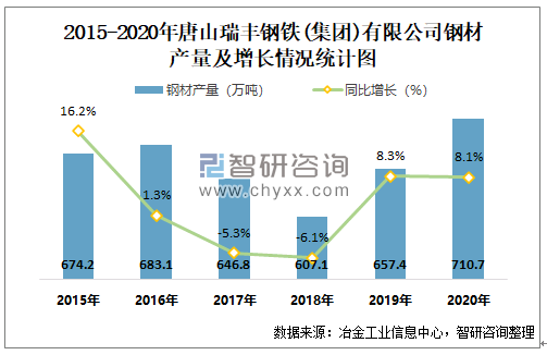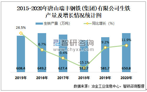 根据冶金工业信息中心数据显示:2020年1-12月唐山瑞丰钢铁(集团)有限公司钢材产量为710.7万吨,同比增长8.1%;粗钢产量为659.9万吨,同比增长5.66%;生铁产量为650.8万吨,同比增长11.89%。