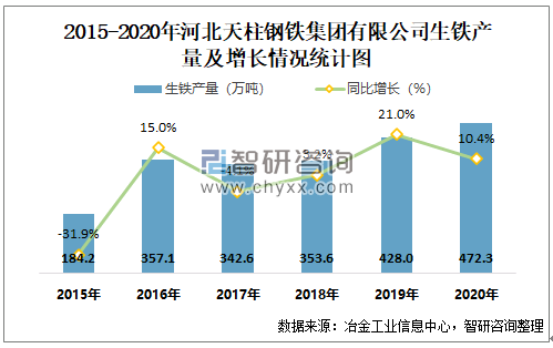 2015-2020年河北天柱钢铁集团有限公司生铁产量及增速趋势图