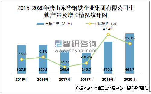 根据冶金工业信息中心数据显示:2020年1-12月唐山东华钢铁企业集团有限公司钢材产量为315万吨,同比增长0.55%;粗钢产量为468.4万吨,同比增长7.3%;生铁产量为463.7万吨,同比增长25.29%。