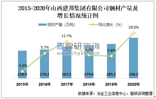 根据冶金工业信息中心数据显示:2020年1-12月山西建邦集团有限公司钢材产量为336.5万吨,同比增长18.03%;粗钢产量为368.8万吨,同比增长16.52%;生铁产量为381.4万吨,同比增长11.06%。