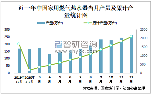 根据国家统计局数据显示:2020年12月中国家用燃气热水器产量为263万台,同比增长27.37%;2020年1-12月中国家用燃气热水器累计产量为2098.8万台,同比增长6.84%;2015-2020年中国家用燃气热水器产量总体呈现上升趋势,2020年达到最高值。