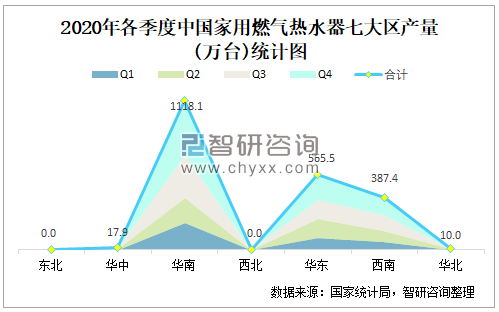 2020年各季度中国家用燃气热水器七大区产量统计图