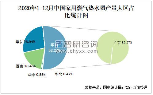 2020年1-12月中国家用燃气热水器产量大区占比统计图