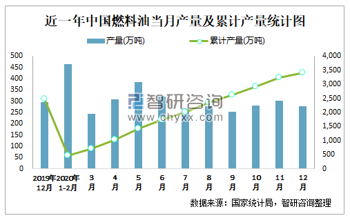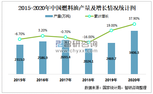 根据国家统计局数据显示:2020年12月中国燃料油产量为277万吨,同比增长17%;2020年1-12月中国燃料油累计产量为3406.3万吨,累计增长37.9%;2015-2020年中国燃料油产量2018年跌至最低值,此后逐年递增。