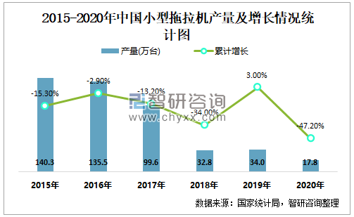 2015-2020年中国小型拖拉机产量及增长情况统计图