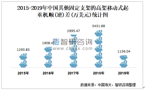 2015-2019年中国其他固定支架的高架移动式起重机顺(逆)差统计图