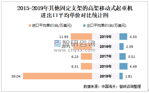2015-2019年中国其他固定支架的高架移动式起重机进出口平均单价对比统计图