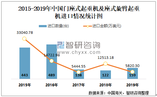 根据中国海关数据显示:2019年1-12月中国门座式起重机及座式旋臂起重机进口数量为159台,进口金额为5820.3万美元;2019年1-12月门座式起重机及座式旋臂起重机出口数量为1402台,出口金额为11580.84万美元。
