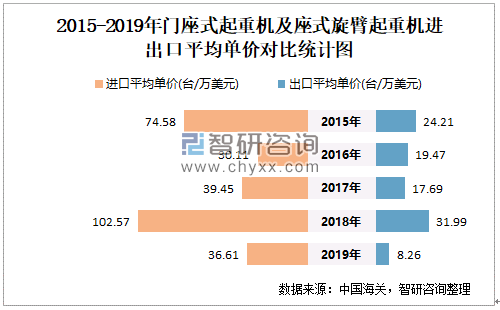 2015-2019年中国门座式起重机及座式旋臂起重机进出口平均单价对比统计图