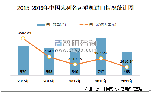 2015-2019年中国未列名起重机进口情况统计图