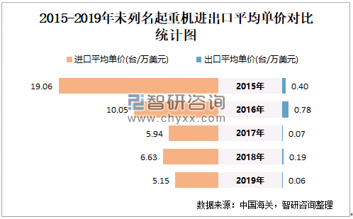 2015-2019年中国未列名起重机进出口平均单价对比统计图