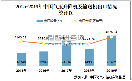 2015-2019年中国气压升降机及输送机出口情况统计图