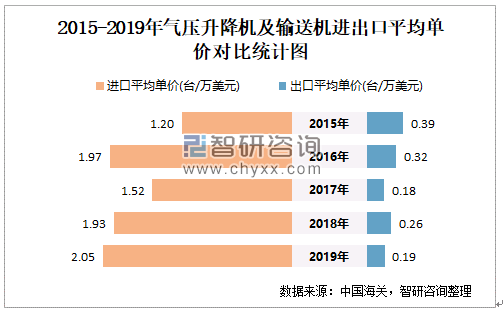 2015-2019年中国气压升降机及输送机进出口平均单价对比统计图