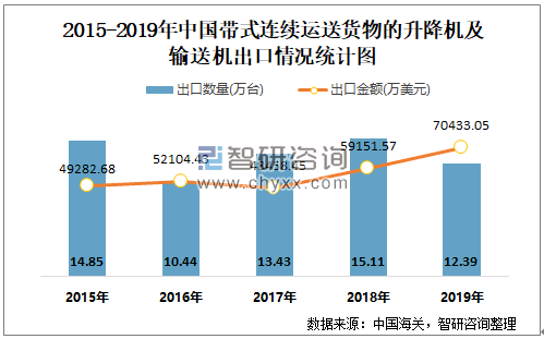 2015-2019年中国带式连续运送货物的升降机及输送机出口情况统计图