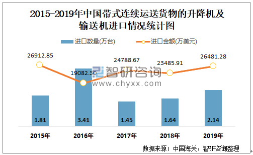 根据中国海关数据显示:2019年1-12月中国带式连续运送货物的升降机及输送机进口数量为2.14万台,进口金额为26481.28万美元;2019年1-12月带式连续运送货物的升降机及输送机出口数量为12.39万台,出口金额为70433.05万美元。