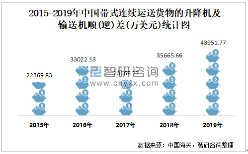 2015-2019年中国带式连续运送货物的升降机及输送机顺(逆)差统计图