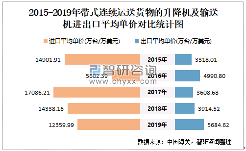 2015-2019年中国带式连续运送货物的升降机及输送机进出口平均单价对比统计图