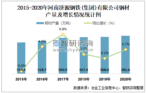 2015-2020年河南济源钢铁(集团)有限公司钢材产量及增速趋势图