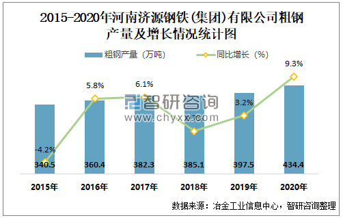2015-2020年河南济源钢铁(集团)有限公司粗钢产量及增速趋势图