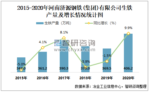 2015-2020年河南济源钢铁(集团)有限公司生铁产量及增速趋势图