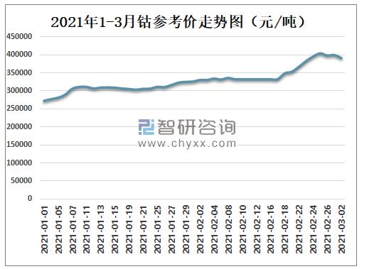 2021年1-3月钴参考价走势图(元/吨)