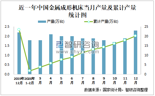根据国家统计局数据显示:2020年12月中国金属成形机床产量为2.3万台,同比增长4.5%;2020年1-12月中国金属成形机床累计产量为20.2万台,累计下降8.6%;2015-2020年中国金属成形机床产量2016年达到最高,此后呈现下降趋势。