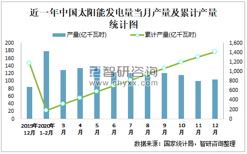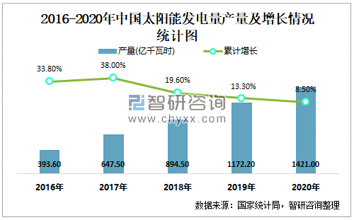 根据国家统计局数据显示:2020年12月中国太阳能发电量产量为104亿千瓦时,同比增长8.9%;2020年1-12月中国太阳能发电量累计产量为1421亿千瓦时,累计增长8.5%;2016-2020年中国太阳能发电量产量逐年递增,2020年达到最高。