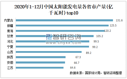 2020年1-12月中国太阳能发电量各省市产量top10