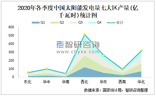2020年各季度中国太阳能发电量七大区产量统计图