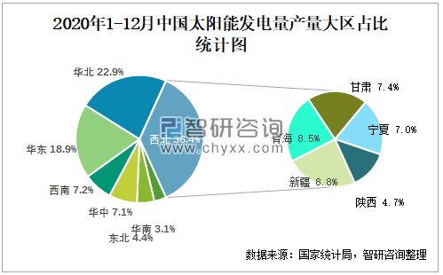 2020年1-12月中国太阳能发电量产量大区占比统计图