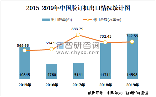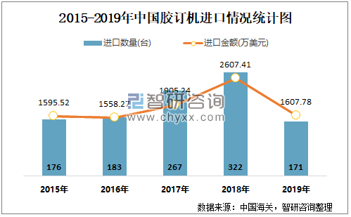 根据中国海关数据显示:2019年1-12月中国胶订机进口数量为171台,进口金额为1607.78万美元;2019年1-12月胶订机出口数量为14593台,出口金额为742.59万美元。
