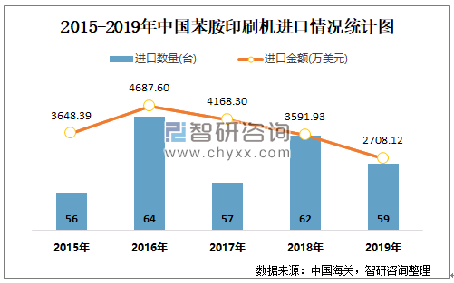 根据中国海关数据显示:2019年1-12月中国苯胺印刷机进口数量为59台,进口金额为2708.12万美元;2019年1-12月苯胺印刷机出口数量为1377台,出口金额为7128.28万美元。