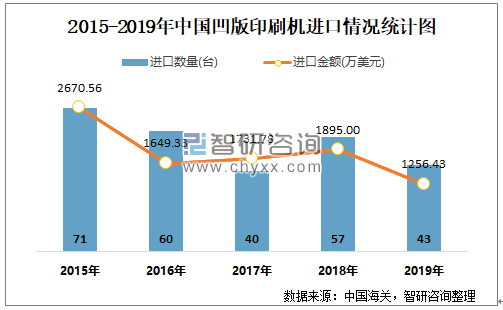根据中国海关数据显示:2015-2019年中国凹版印刷机进口数量与进口金额均在2019年下降至最低值;2015-2019年中国凹版印刷机出口金额2017年达到最高值,此后逐年下降。