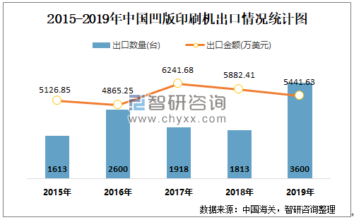 根据中国海关数据显示:2019年1-12月中国凹版印刷机进口数量为43台,进口金额为1256.43万美元;2019年1-12月凹版印刷机出口数量为3600台,出口金额为5441.63万美元。
