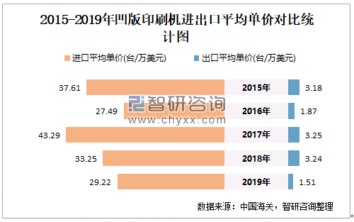 2015-2019年中国凹版印刷机进出口平均单价对比统计图