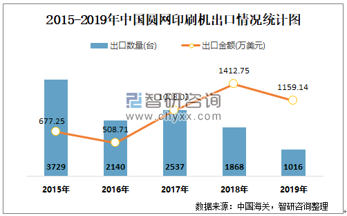 根据中国海关数据显示:2019年1-12月中国圆网印刷机进口数量为21台,进口金额为914.94万美元;2019年1-12月圆网印刷机出口数量为1016台,出口金额为1159.14万美元。
