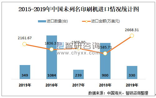 根据中国海关数据显示:2015-2019年中国未列名印刷机进口金额2019年达到最高值;2015-2019年中国未列名印刷机出口数量2016年达到最高值,出口金额近3年逐年上升。