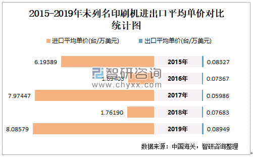 2015-2019年中国未列名印刷机进出口平均单价对比统计图