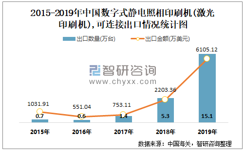 根据中国海关数据显示:2019年1-12月中国数字式静电照相印刷机(激光印刷机),可连接进口数量为4.11万台,进口金额为8954.6万美元;2019年1-12月数字式静电照相印刷机(激光印刷机),可连接出口数量为15.13万台,出口金额为6105.12万美元。
