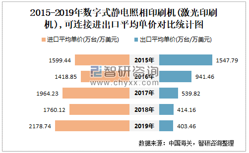 2015-2019年中国数字式静电照相印刷机(激光印刷机),可连接进出口平均单价对比统计图