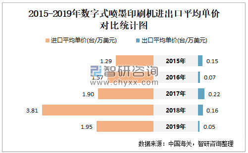 2015-2019年中国数字式喷墨印刷机进出口平均单价对比统计图