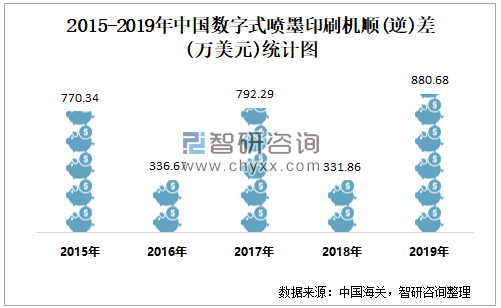 2015-2019年中国数字式喷墨印刷机顺(逆)差统计图