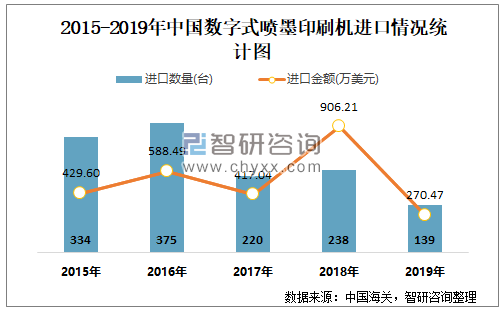 2015-2019年中国数字式喷墨印刷机进口情况统计图