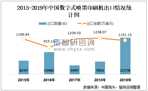 2015-2019年中国数字式喷墨印刷机出口情况统计图
