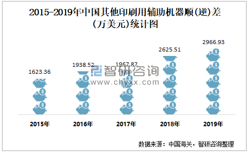 2015-2019年中国其他印刷用辅助机器顺(逆)差统计图