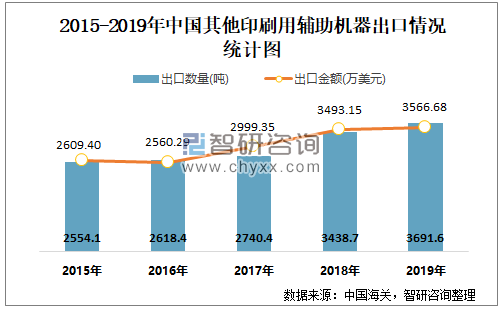根据中国海关数据显示:2019年1-12月中国其他印刷用辅助机器进口数量为178.14吨,进口金额为599.75万美元;2019年1-12月其他印刷用辅助机器出口数量为3691.63吨,出口金额为3566.68万美元。