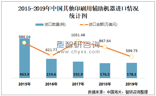2015-2019年中国其他印刷用辅助机器进口情况统计图