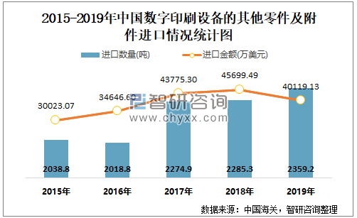 根据中国海关数据显示:2019年1-12月中国数字印刷设备的其他零件及附件进口数量为2359.25吨,进口金额为40119.13万美元;2019年1-12月数字印刷设备的其他零件及附件出口数量为5096.69吨,出口金额为11949.8万美元。